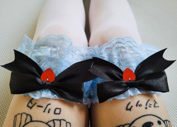 Bucaneras de lycra opacas con puntilla elástica y moños delanteros de raso con lentejuela plana láser corazón roja. Talle único -adolescentes / adultos-.